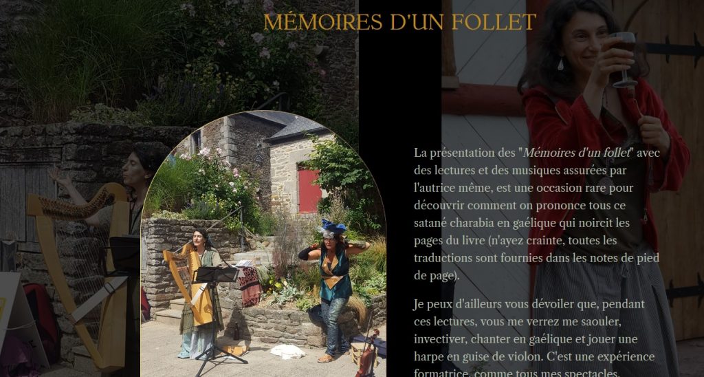 Du moment que chacun de mes livres cite abondamment de la musique, force il a été d’en tirer des spectacles: lectures, mimiques, quelques esquisses de costumes et musiques assorties: de sean nos en gaélique et danses irlandaises, ballades anglaises pour les Mémoires d’un follet, gwerzoù bretons, Barzaz breiz, musiques des Balkans, de la Venise baroque et de Scandinavie pour La harpe d’os.