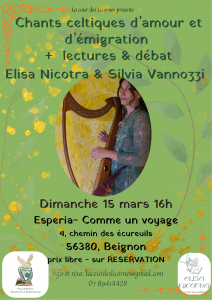 Pour le décrochage de l’exposition de Mihaila Murariu et Laetitia Lavieville, en occasion de la fête de la femme, une invitation musicale à traverser les mers et les forêt en quête des archétypes du féminin: ce concert pour harpe celtique et chant est ponctué de contes et saynètes d’Italie, Bretagne, Suède et Iles Britanniques, illustrant les chansons, recréant avec la musique et la parole un jeu de cartes où reines et paysannes, sorcières et piratesses se donnent la main pour danser les siècles.